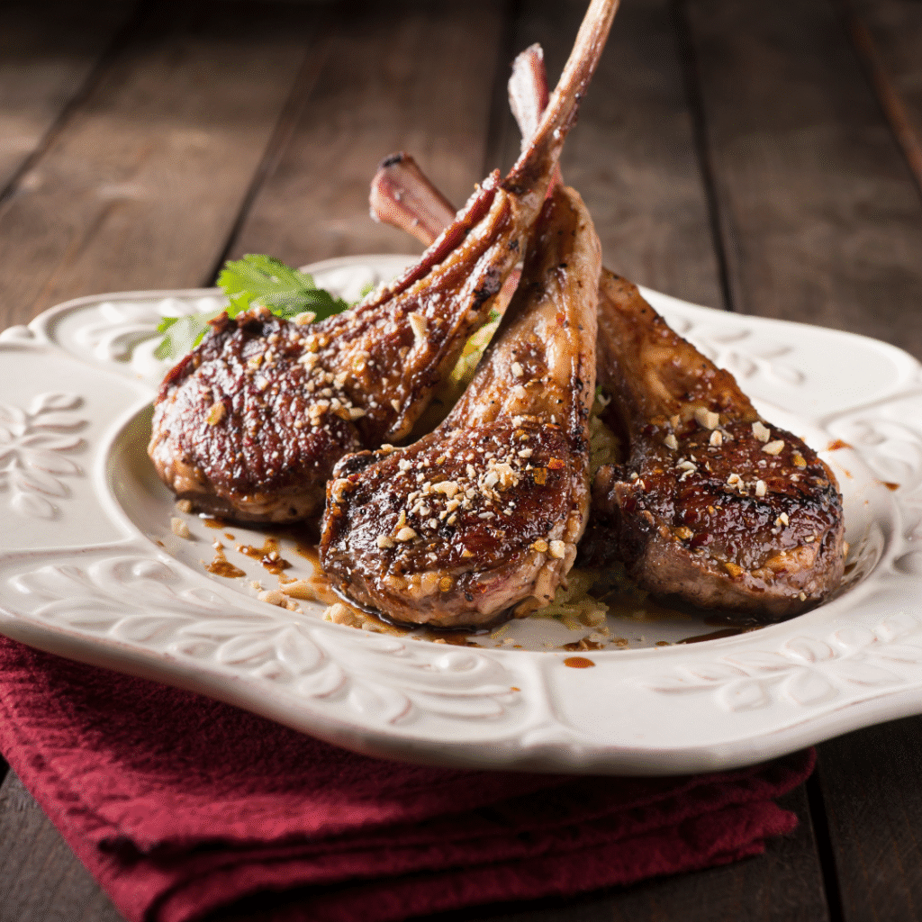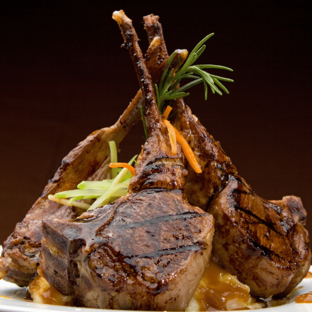 • Arrange lamb chops on a premium white porcelain plate. Drizzle the mint sauce generously over the top.